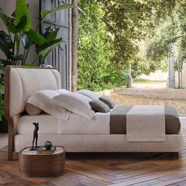 Designer modern upholstered bed with wooden frame around the headboard, and wooden legs. A soft and comfortable option. By Conte Casa.