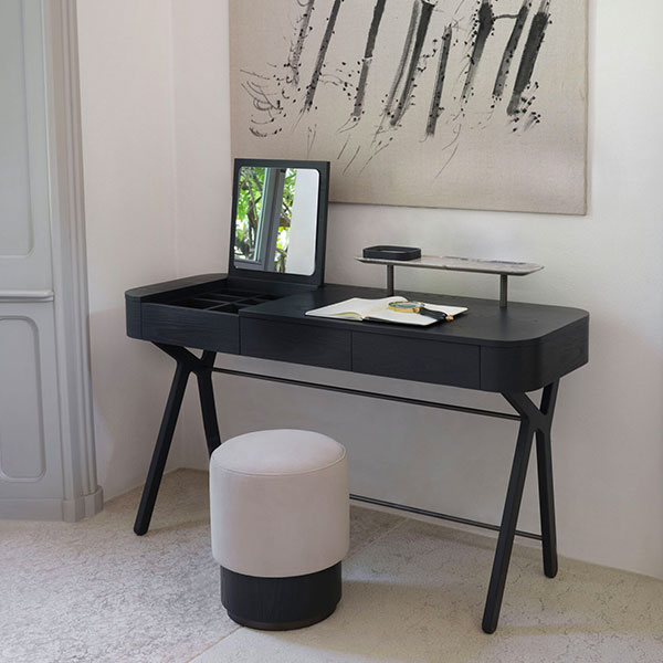 Featuring a lightweight solid wood structure, with the top surface and drawers crafted from leather and wood respectively. It also has a small, elevated marble shelf on the side. By Conte Casa.