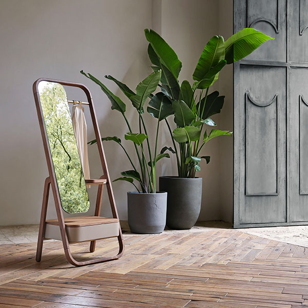 Freestanding mirror made of a wooden frame, featuring coat hangers, an accessory tray and a drawer at the bottom for storage. By Conte Casa.