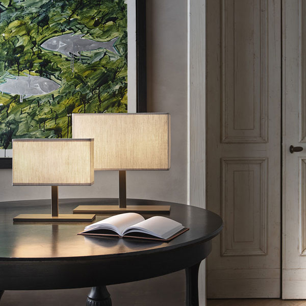 A minimal metal support sustains a rectangular fabric shade in this table lamp which shows all the elegance of simplicity, for a light effect of great