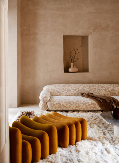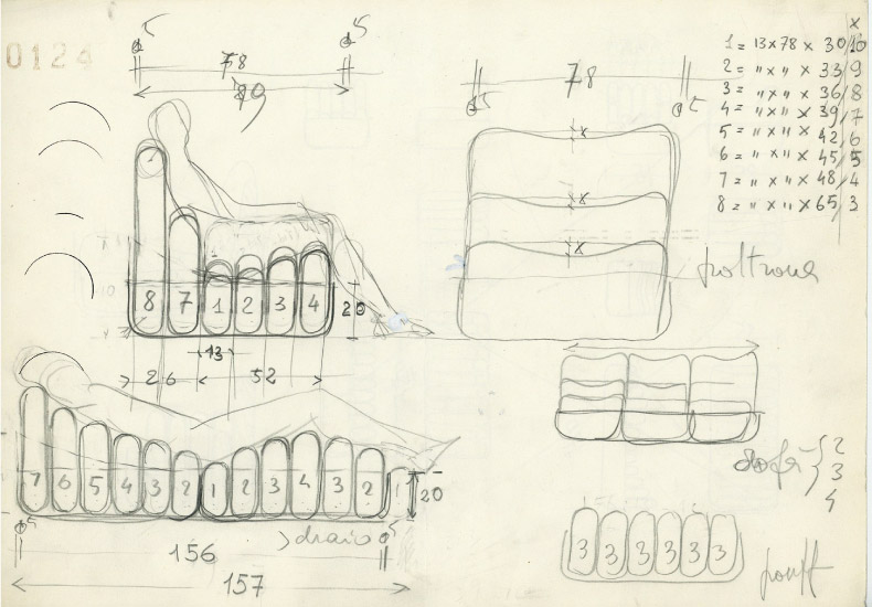 Originally by Joe Colombo from 1967, reimagined today by Tacchini: a modular system of six different sized cushions forming an interesting shape like a sculpture.